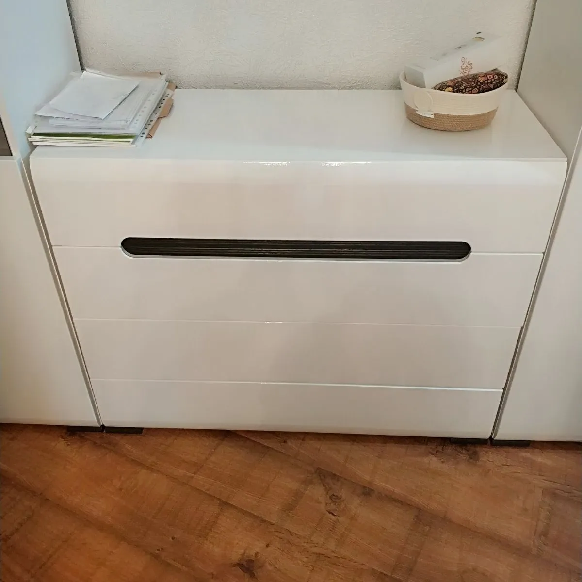 Отличный комод.Искал красивую тумбу под ТВ,но нашел прекрасный комод..Сейчас нет DVD, видиков,саундбар заменяет акустику,а в комод можно использовать и по своему назначению еще.Дизайн комода на высоте,фронтальные панели глянцевые в защитной пленке,МДФ хороший,дорогие направляющие Hafele скрытые с доводом при окончании закрытия.Ручки для открывания ящиков нормальные,немного неудобно,но зато фасад комода свободен от этого.Разметка для сборки отличная,при сборке есть нюансы,но интересно самому разобраться в этом,время,конечно заняло,инструкция так себе.Место для хранения не очень много,но меня устраивает.В общем отличный добротный комод.Дошло все в отличном состоянии,продавец все зарешетил в дерево.Доставка была из Москвы Деловыми линиями.Продавец отличный,по цене самый гуманный.Спасибо Мебель голд за отличную цену,за упаковку и доставку.Все очень профессионально,приятно иметь с вами дело.Спасибо Озон за возможность купить очень качественный товар.