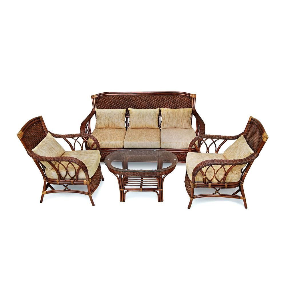 Великолепный комплект для отдыха «Андреа» прекрасно впишется в интерьер загородного дома, летней веранды или сада. Компактный овальный столик со стеклянной столешницей, уютный 3х-местный диван и два высоких кресла в колониальном стиле изготовлены вручную из натурального ротанга. В дизайне используется несколько видов традиционного индонезийского плетения. Изысканная отделка в цвете «античный орех» выполнена методом тонирования и нанесения темной патины. Финишное покрытие — прочный матовый лак, устойчивый к УФ-излучению. Для большего удобства мебель комплектуется большими декоративными подушками кремового цвета. Страна-производитель: Индонезия