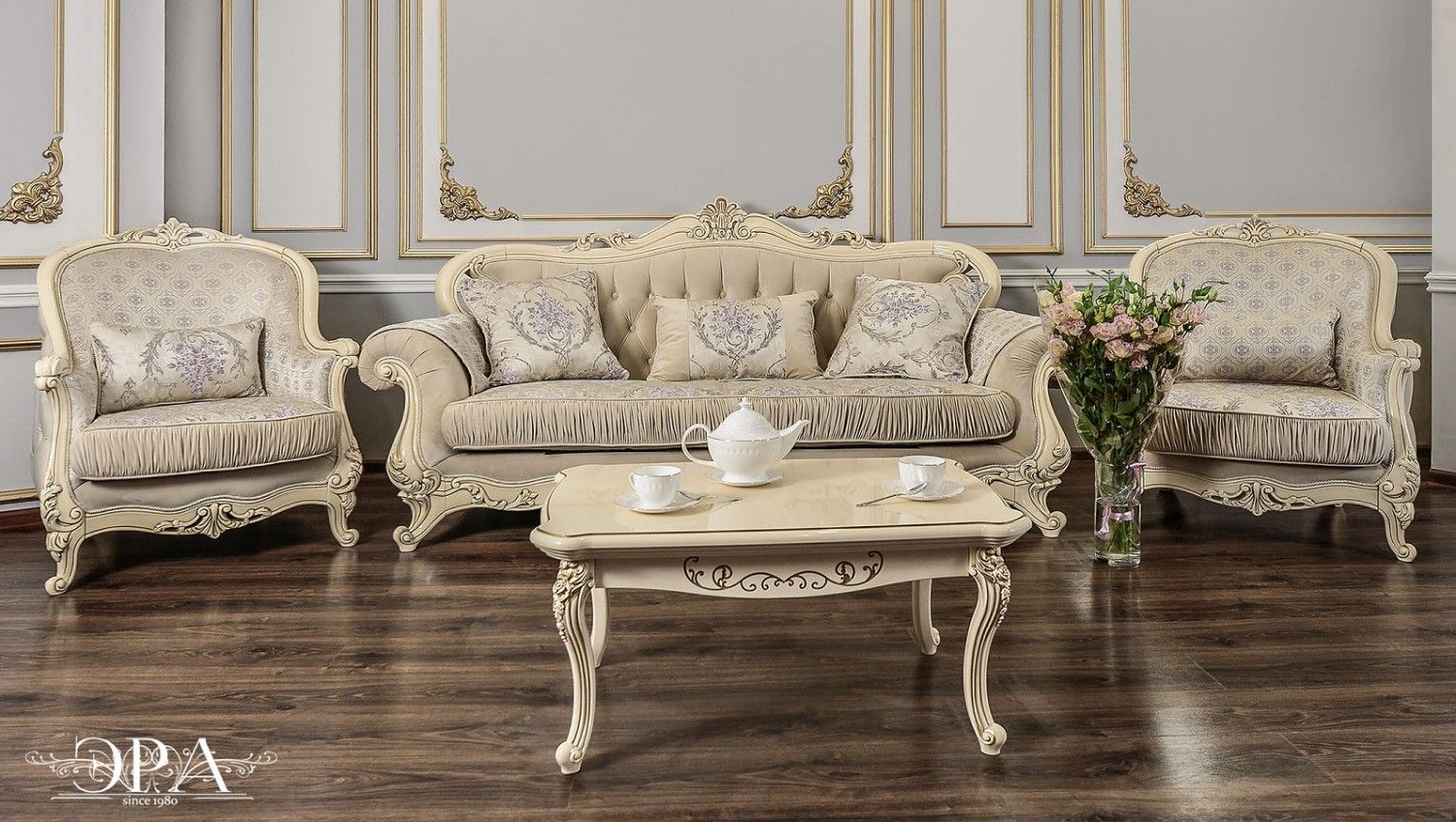 Комплект мебели «Мона Лиза» крем – вариант для тех, кто ищет готовые решения в едином стиле и цветовой гамме. Он оформлен в классическом стиле и представляет собой универсальное решение, предназначенное не только для гостиной, но и спальни и рабочего кабинета. Набор включает прямой диван с полукруглыми подлокотниками и два кресла на изогнутых ножках.