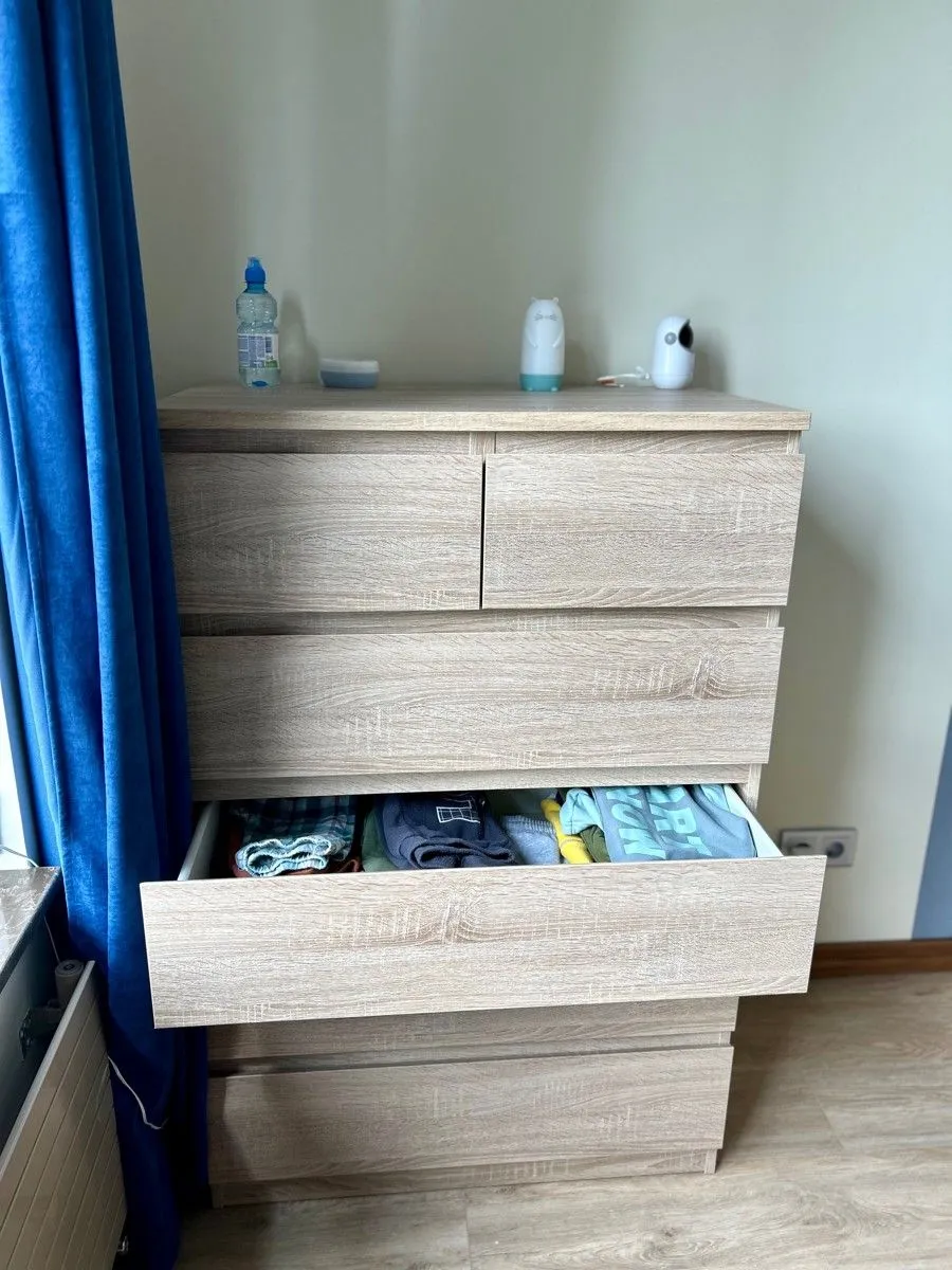 В целом комод симпатичный, вместительный, функциональный. Удобная высота, особенно для тех, у кого маленькие дети. Разделение верхней секции на 2 ящика очень практична. Доставляется в 3 компактных коробках, упаковка надежная. Из минусов: инструкция по сборке для опытного сборщика, нет доводчиков в ящиках.