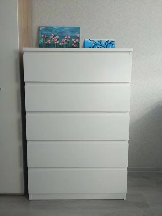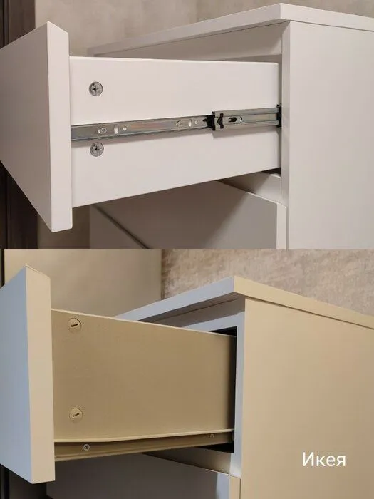 Качественное исполнение, отсутствие сколов и брака, все отверстия на своих местах, отсутствие проблем при сборке.. Комод очень похож на оригинальную Икею, в том числе при сборке (на прикреплённом фото рядом с комодом стоит тумба из Икеи). Однако покрытие фасадов всё же отличается: у оригинальной Икеи это покрытие было более твердое и износостойкое, а здесь же более мягкое и тонкое, из-за чего более высок риск образования вмятин и повреждений. В целом же комод достаточно качественно выполнен, все детали ровные, не косят и легко соединяются. Из достоинств также отмечу, что у ящиков шариковые направляющие (в отличие от роликовых у Икеи), в связи с чем ящики выдвигаются на большую длину (30 см против 27 см у Икеи). Как итог, покупкой довольны. P.S. При покупке обращайте внимание на продавца, поскольку часть отзывов на Маркете относится к комоду с совершенно другими характеристиками.