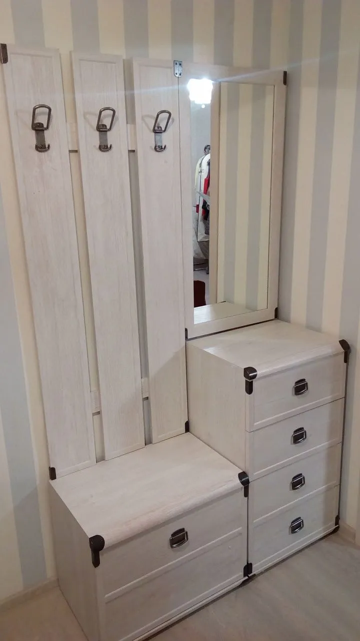 Хорошая светлая прихожая, для квартиры среднего размера – то, что нужно. Мебель очень вместительная, удобно сделана вешалка.