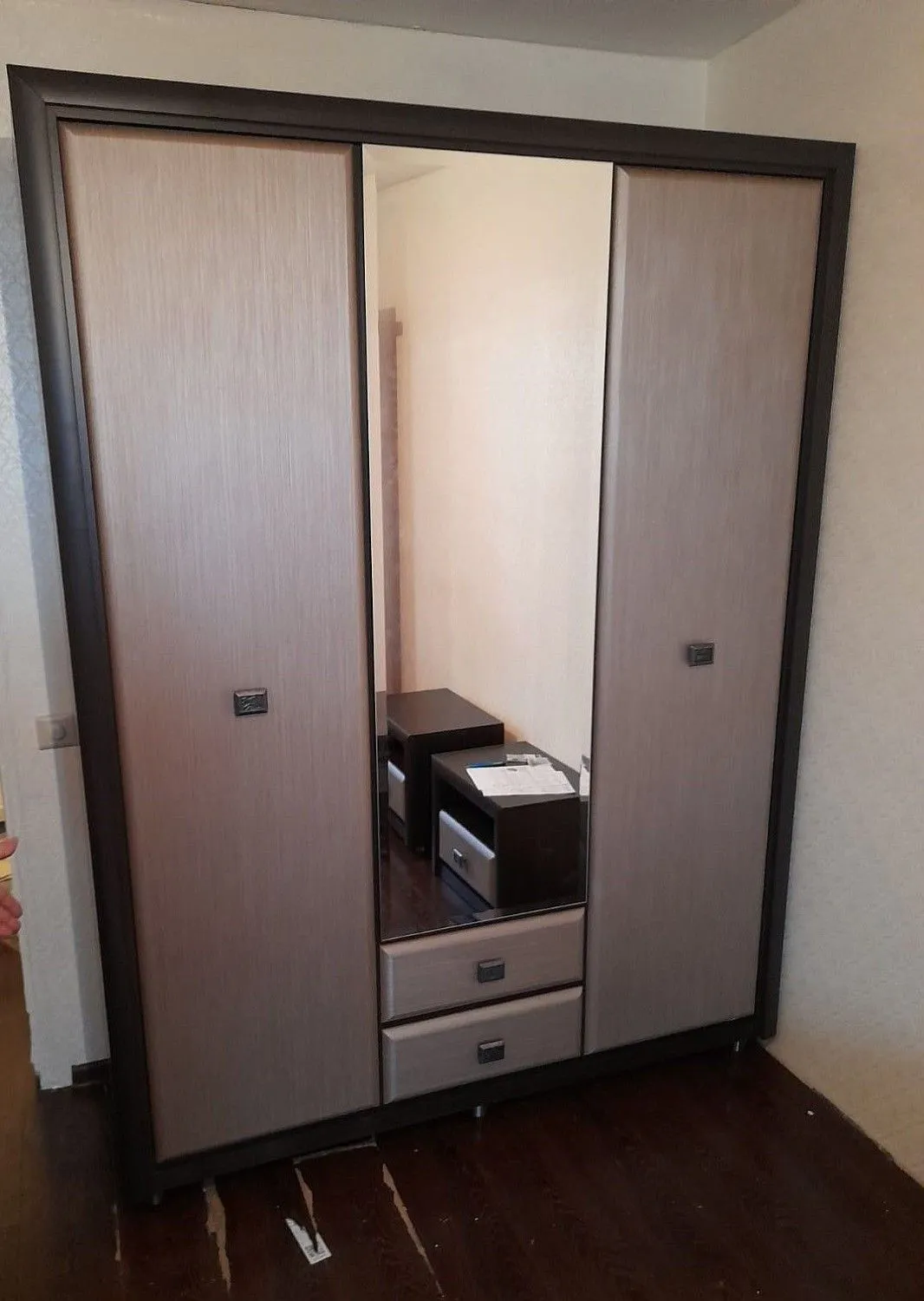 По центру шкафа Koen SZF3D2S расположено зеркало, периметр украшен декоративной планкой из МДФ. Корпус оформлен в цвете венге, а фасады покрыты светло-коричневой ламинированной пленкой с имитацией текстуры штрокс. Такая контрастная отделка вместе с металлическими квадратными ручками придает мебели индивидуальный вид.