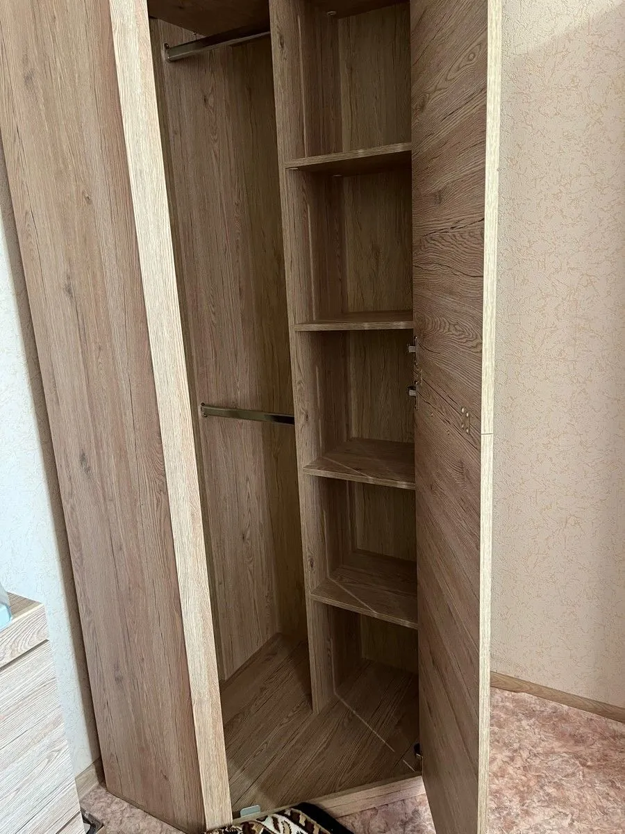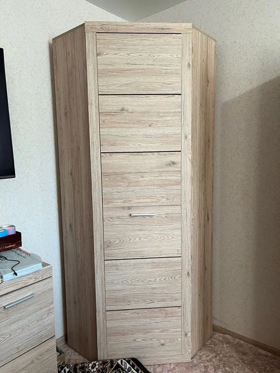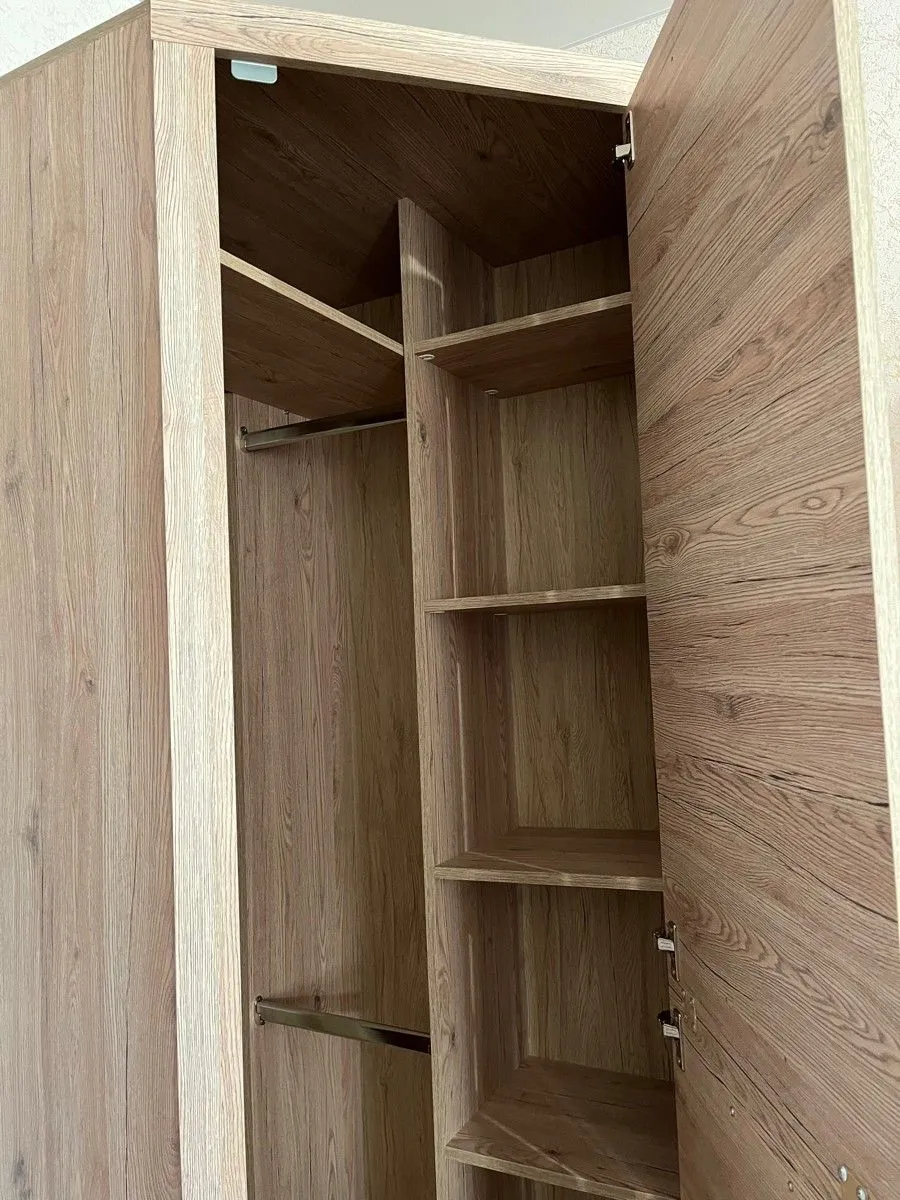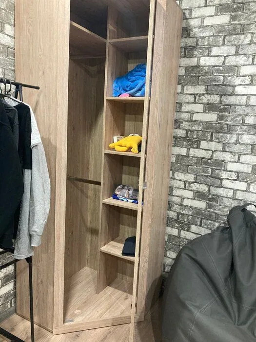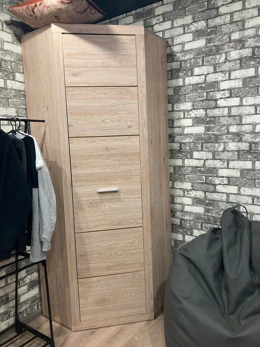 Угловой шкаф с полками Oskar L- P привлекает вместительностью и гармоничной подборкой внутренних элементов. При ширине 77 см и аналогичной глубине его конструкция содержит одну распашную дверь, 2 металлические штанги и 4 боковые полки. Модель изготовлена на белорусском предприятии Anrex с использованием экологически безопасного материала ЛДСП класса Е1.
