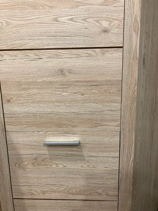 Минималистичный дизайн углового шкафа с полками Oskar L- P подчеркивает прямая ручка серебристого оттенка и простые фасады без декора. Его поверхность повторяет текстуру дуба санремо с естественными трещинками и рисунками годовых колец. Фасады имеют легкий бежевый оттенок. Они гармонично вписываются в интерьеры современного стиля.