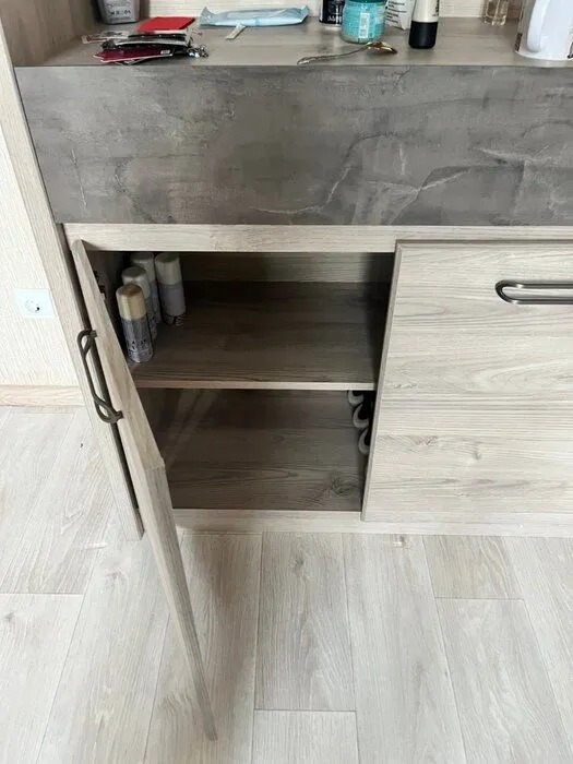 Шкаф JAZZ 3D1SN демонстрирует необычную комбинацию открытых и закрытых отделений. Вверху и в середине оборудованы открытые секции, в середине и внизу установлено два дополнительных отделения с откидной и распашной дверцей. Оригинальность модели с цветом фасадов каштан наироби придает декоративная вставка на ящике с оттенком оникс. Модель с такой отделкой смотрится гармонично и не броско.