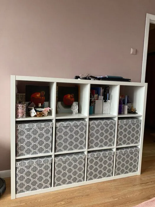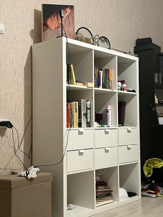 удобный классический стеллаж в стиле Икеа, собрали легко. докупали еще ящики, вот с ними было уже сложнее потому что не было разметки, так как стелаж изначально подразумевается без ящиков