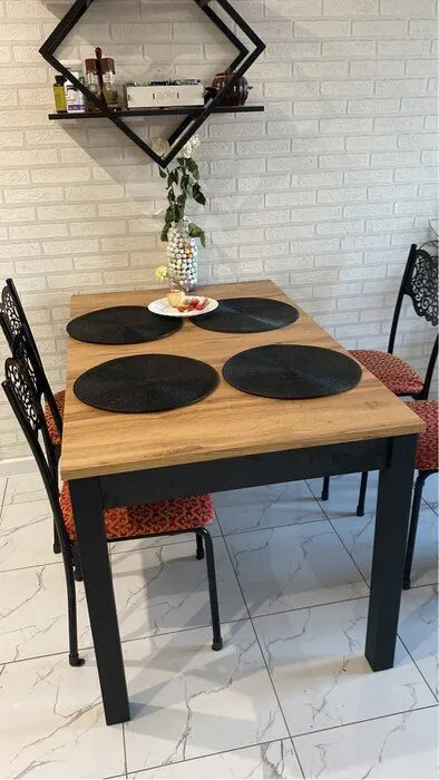 Корпус белорусского обеденного стола Loft изготовлен из ламинированной плиты ДСП. При производстве ножек используется МДФ черного цвета. Материалы выдерживают механическое и термическое воздействие. Не создают сложностей в уборке.