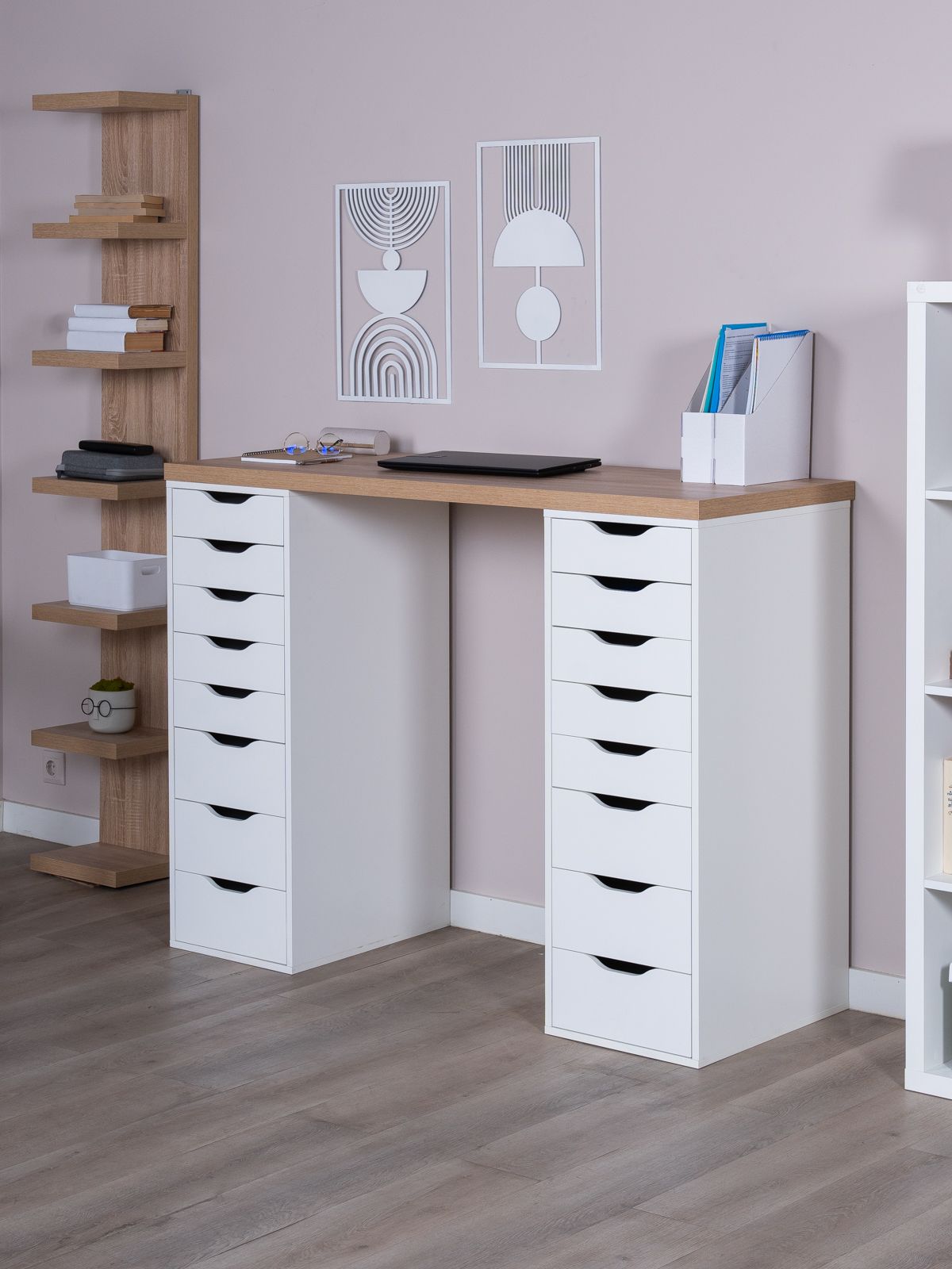 Этот стильный и функциональный стол выполнен в цвете беленого дуба и имеет 16 вместительных ящиков, что позволит хранить все необходимые школьные принадлежности или рабочие документы в порядке. Размеры стола — 140х106х55 см, что делает его достаточно большим, чтобы обеспечить комфортное рабочее пространство.