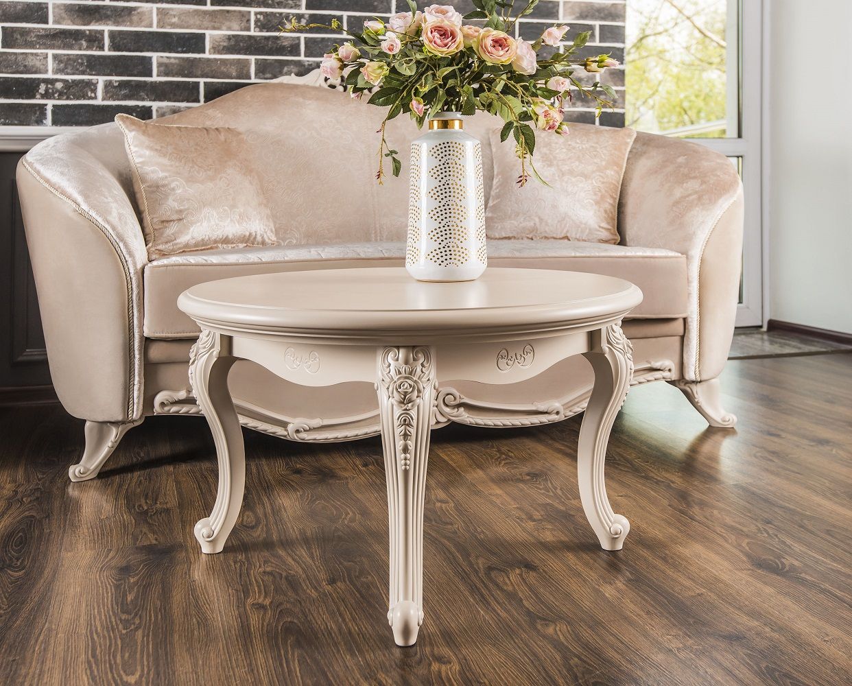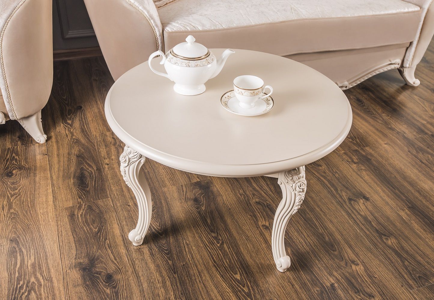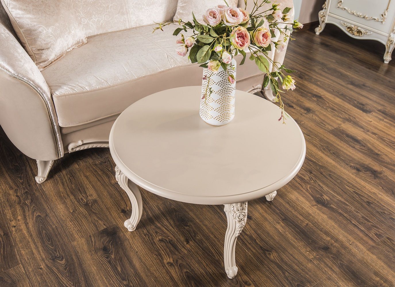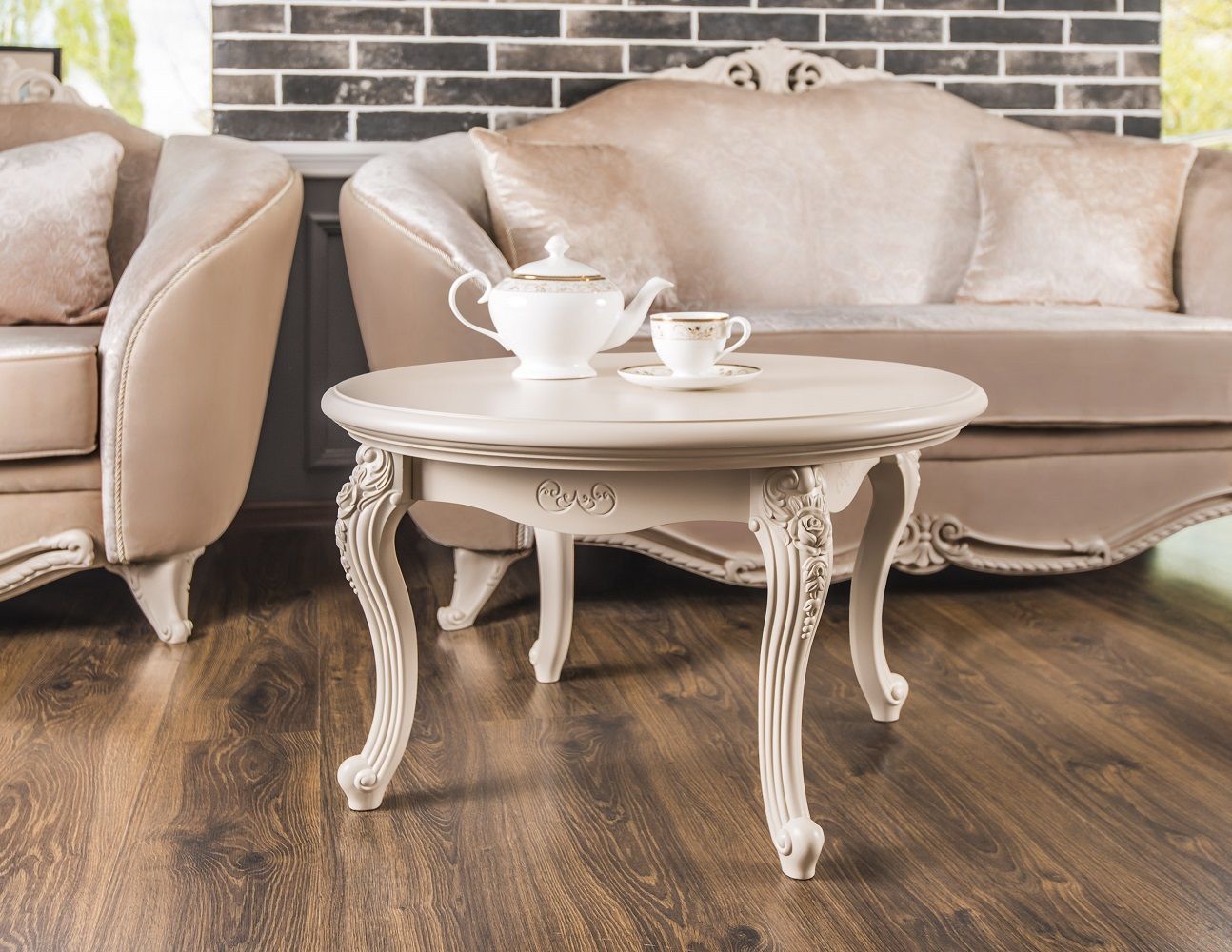 МОККО — это столовая группа с круглым столом и мягкими стульями на античных ножках.
