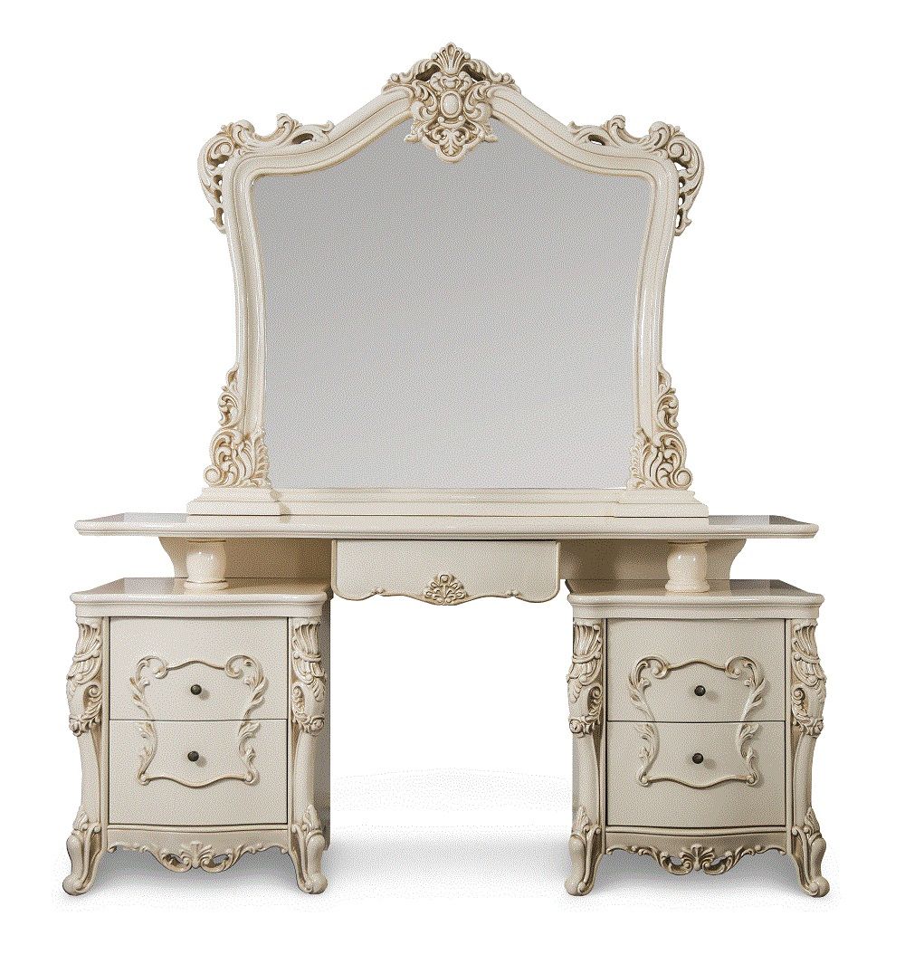 Туалетный столик «Джоконда» ‑ настоящее олицетворение роскошной жизни. Он создан, чтобы вдохновлять и радовать, делиться теплом и чувствовать свою исключительность. Такой стол смотрится благородно, он легко заменяет косметическое трюмо и вписывается в интерьер классической спальни. Он привлекает внимание филигранно изогнутыми ножками и бесконечно нежным кремовым цветом. Узоры с золочением придают такой мебели дорогой и торжественный вид, и сделает комнату похожей на будуар принцессы.