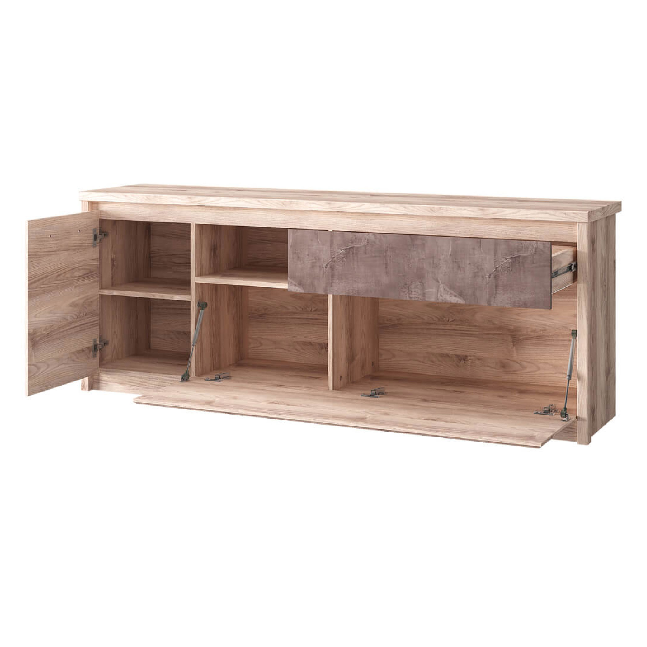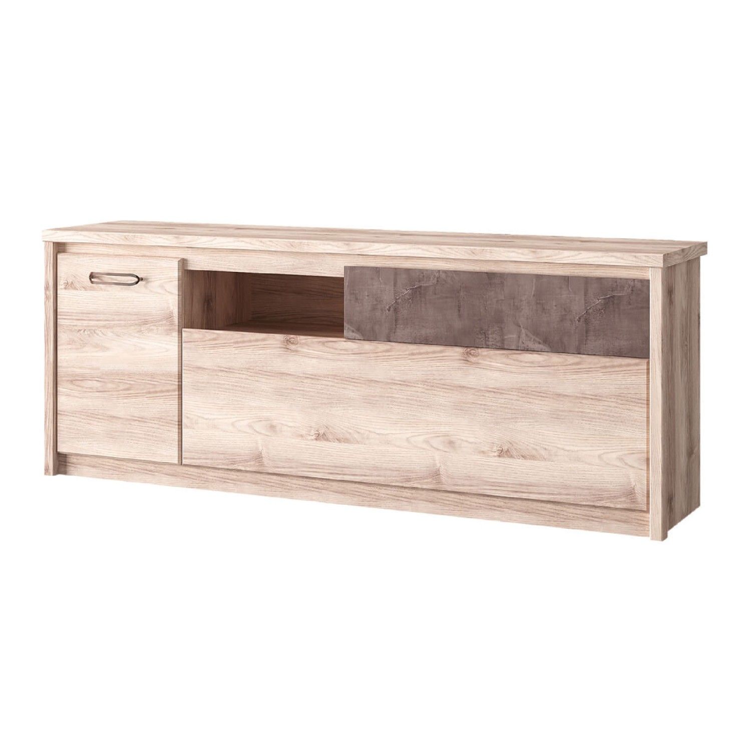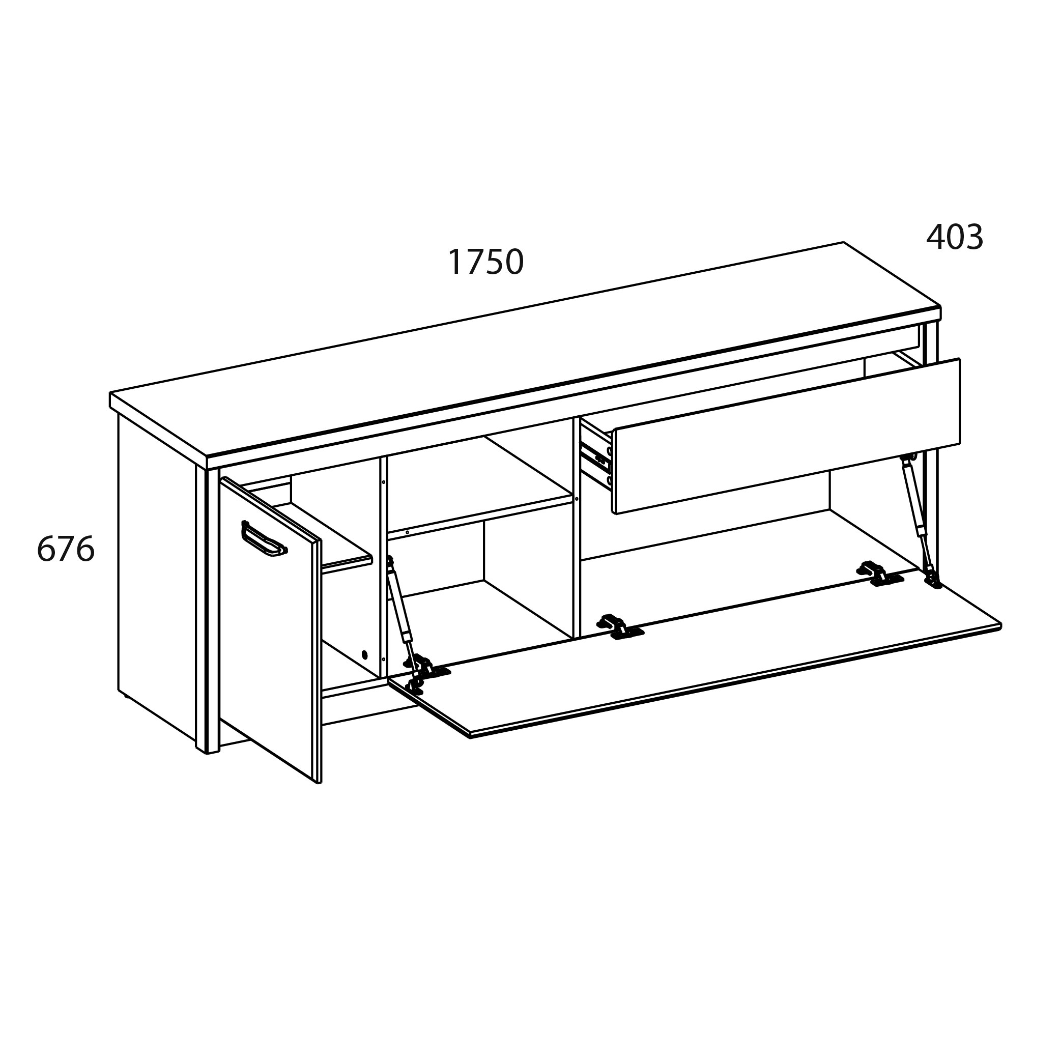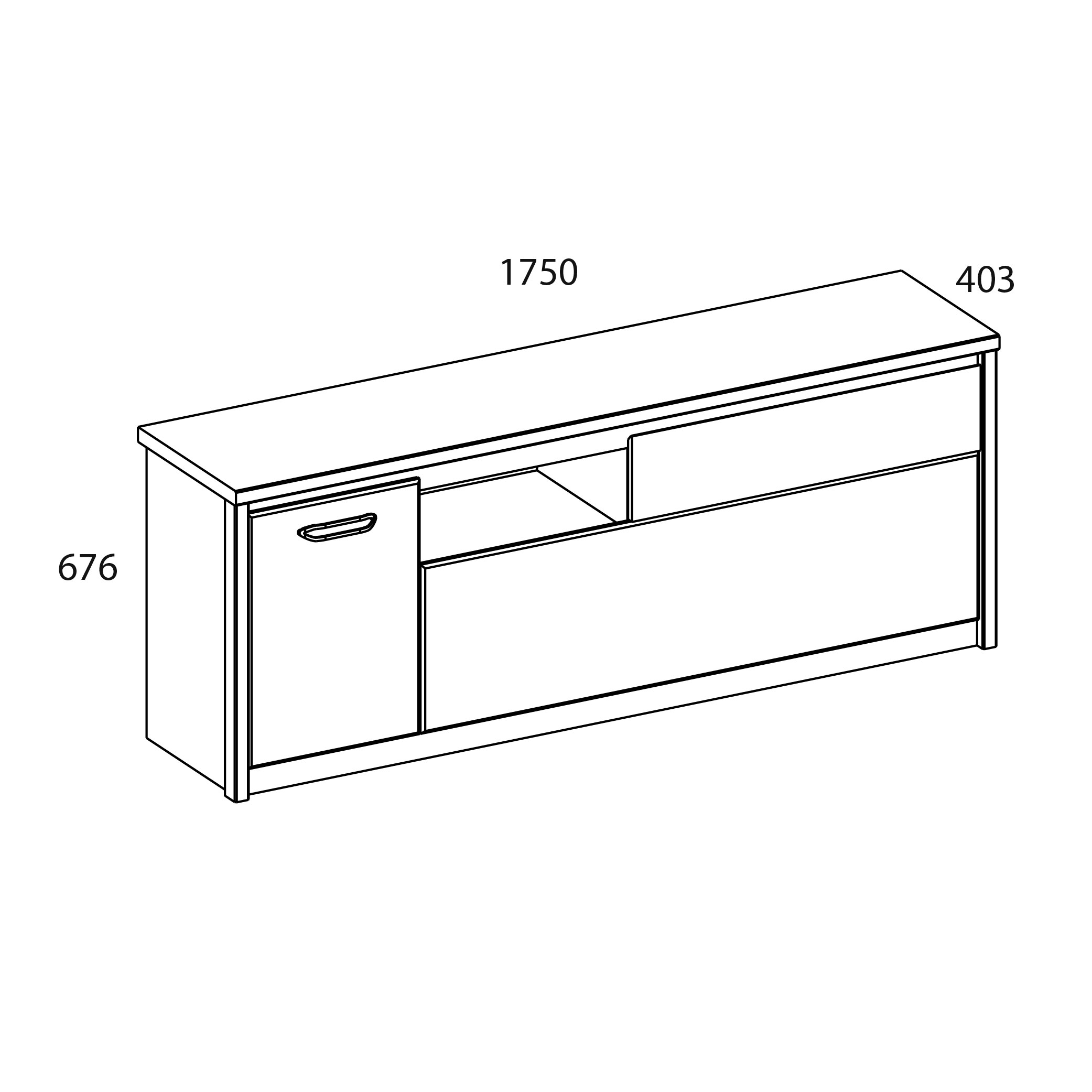 Тумба RTV 2D1SN JAZZ – организатор тв-зоны с расширенным функционалом. Прямая конструкция, которая представляет собой два отделения за глухими фасадами (распашным и откидным), один выдвижной ящик (1S) и нишу (N). Отличается от тумбы RTV 1D1SN шириной и высотой.