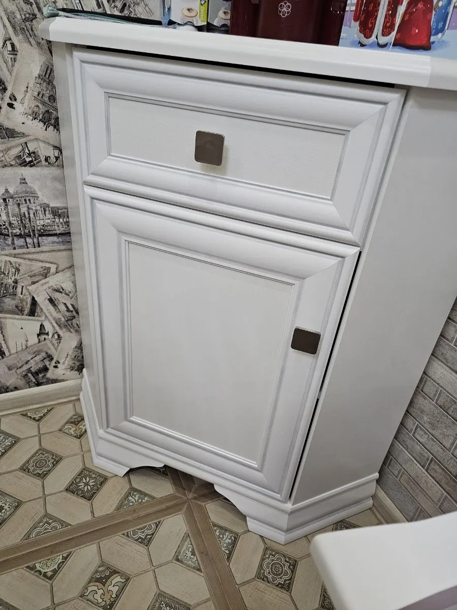 Угловую белую тумбу с ручками под бронзу, матовыми фасадами и элегантными филенками устанавливают в любые помещения, где важен порядок и красота. Эта тумба высотой 90 см и шириной 58,5 см отлично заменит комод, а глубокая ниша (58,5 см) подойдет для хранения массы вещей.