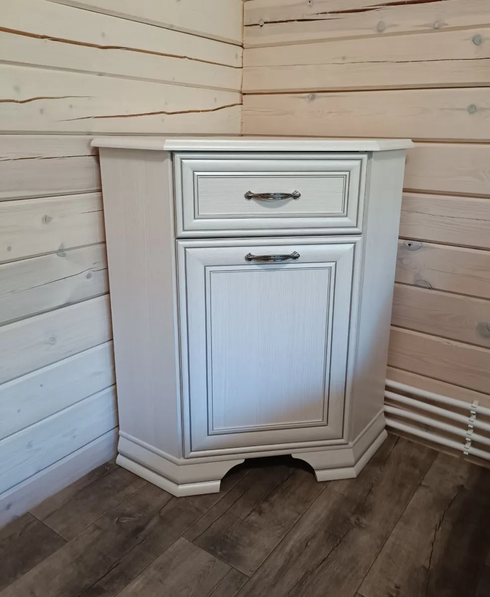 Удобный угловой шкафчик. Цвет для меня оказался не очень подходящим. Как будто оклеено бумагой. Пришлось покрасить. К этой тумбе покупала угловой подвесной шкафчик . Смотрится как витрина.