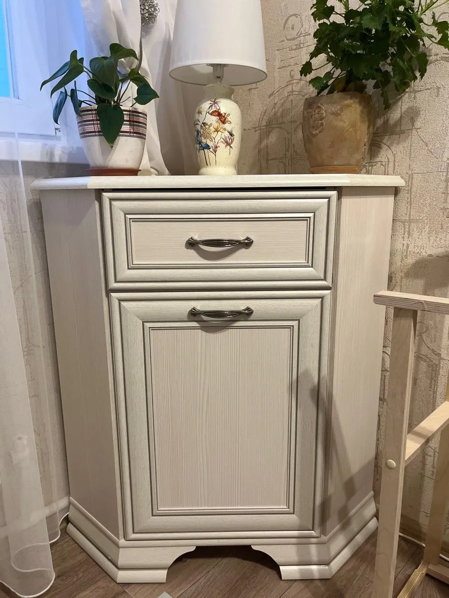 Небольшая угловая тумба с распашной дверью и выдвижным ящиком Tiffany – это мебель белорусского производства Anrex. Несмотря на внешнюю компактность, ее глубина составляет 58 см. И это благодаря угловой конструкции тумбочки. Она подходит для хранения не громоздких вещей. Ее ящик на роликовых направляющих выдерживает вес до 25 кг. За глухими дверцами находятся вместительные отделения с полками.