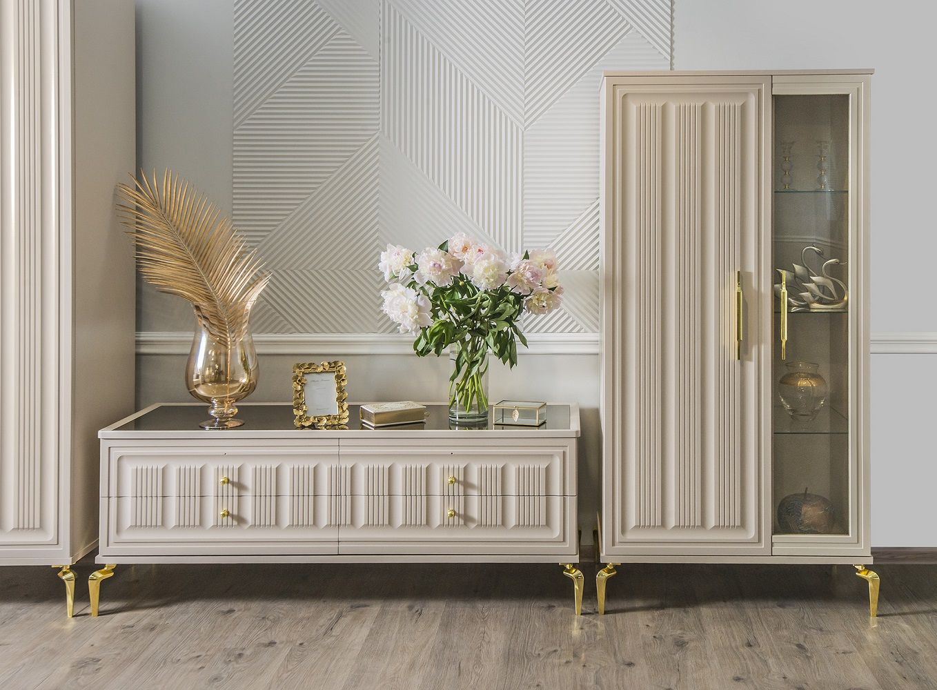 ФасадМДФ с фрезеровкой и вставкой из пластика под латунь/хром + стеклянная дверь с фрезеровкой МДФ;