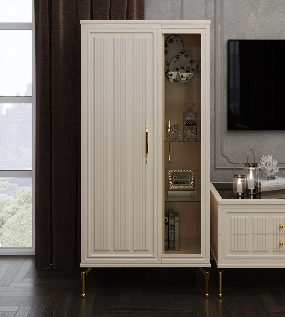 Внутреннее наполнениеШкаф разделен на 2 секции: за щитовой дверью – 4 щитовые полки, за дверью со стеклом – 4 стеклянные полки;